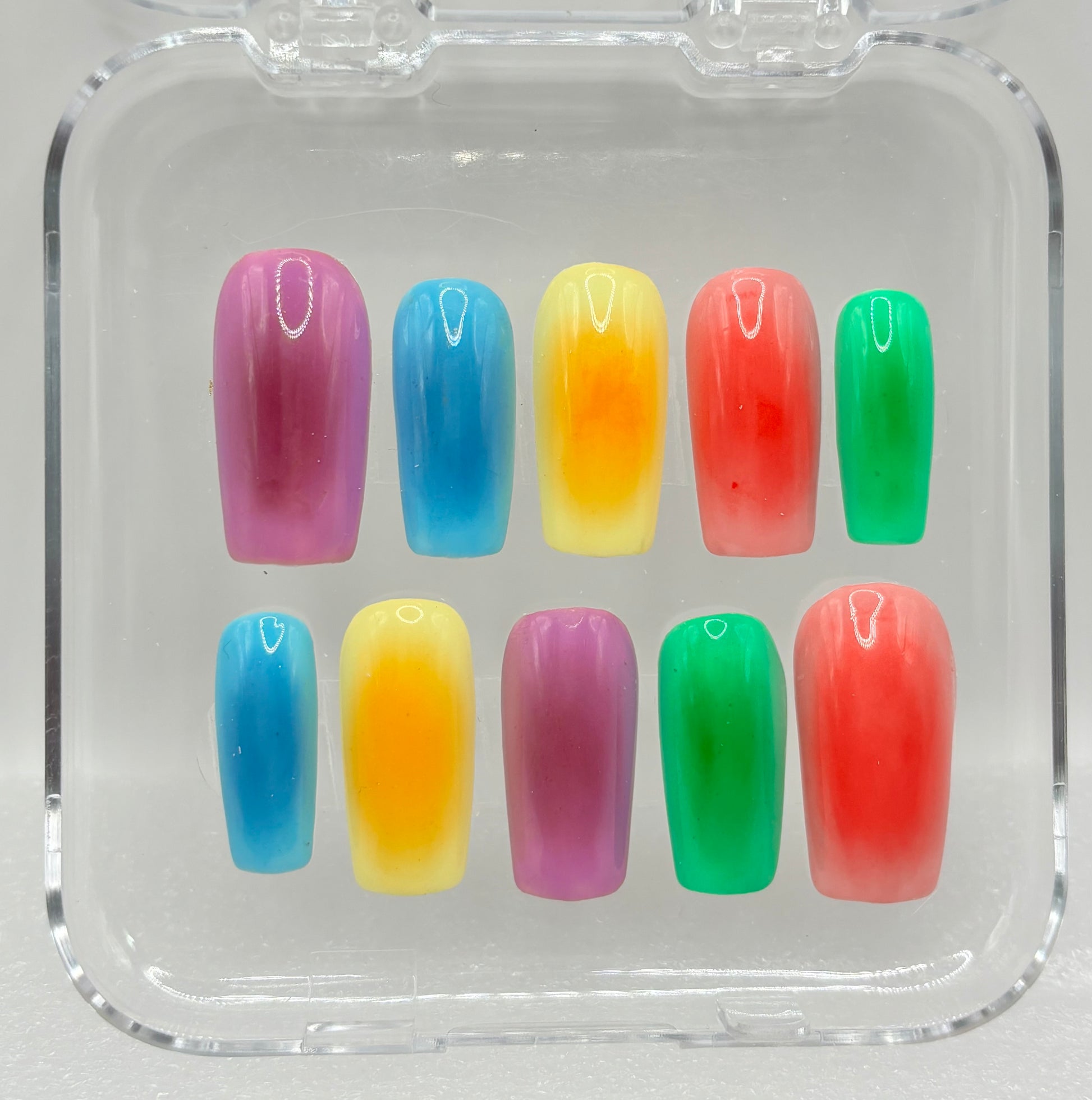 Add a splash of color with this vibrant and gradient set! Each nail melts from one juicy color to the next, creating a bold, fun, and eye-catching finish that screams summer fun.